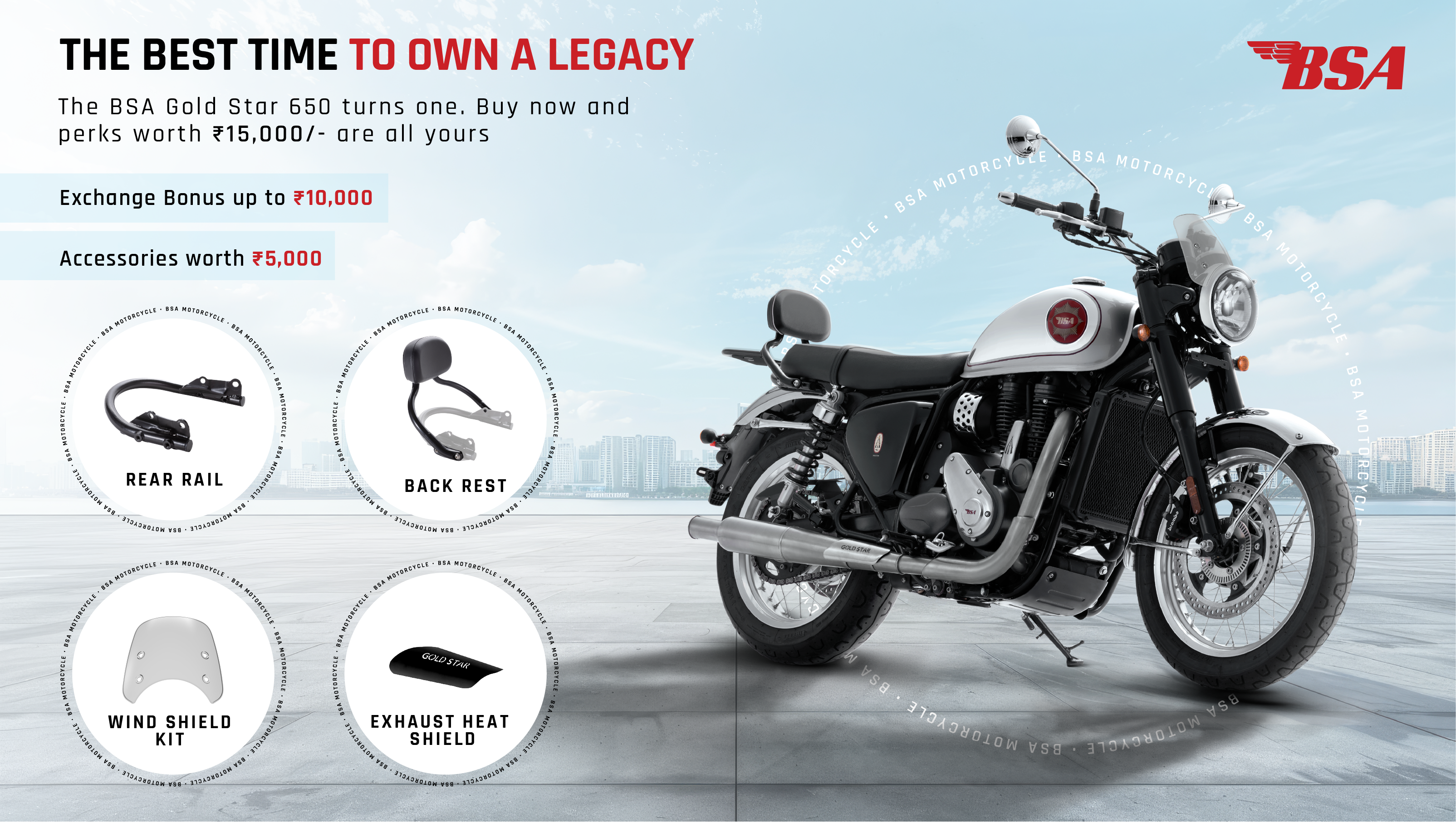 यह एक्सचेंज प्रोग्राम 23 अगस्त से 23 सितम्बर 2025 तक चलेगा। 5,896 रुपये मूल्य की खास एक्सेसरी किट के साथ मिलाकर कुल 15,896 रुपये का लाभ होगा। यह बीएसए की ऐतिहासिक विरासत को सम्मान देने वाला वर्षगांठ का तोहफ़ा है, जिसने 1861 से विश्व मोटरसाइक्लिंग में अपनी छाप छोड़ी है। क्लासिक लेजेंड्स, बीएसए मोटरसाइकिलों के निर्माता, ने जीएसटी 2.0 सुधारों के बाद बीएसए गोल्ड स्टार के लिए संशोधित कीमतों की घोषणा की है। 21 सितंबर से पहले गोल्डी खरीदने वाले सवार एक्स-दिल्ली शोरूम मूल्य पर 23,702 रुपये तक बचा सकते हैं।