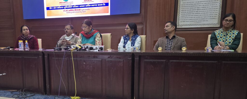 लखनऊ। किंग जॉर्ज चिकित्सा विश्वविद्यालय (केजीएमयू ) के प्रशासनिक भवन स्थित ब्राउन हॉल में प्रेस कॉन्प्रâेंस का आयोजन किया गया। कार्यक्रम को पद्मश्री से सम्मानित तथा कुलपति प्रो. सोनिया नित्यानंद ने संबोधित किया।