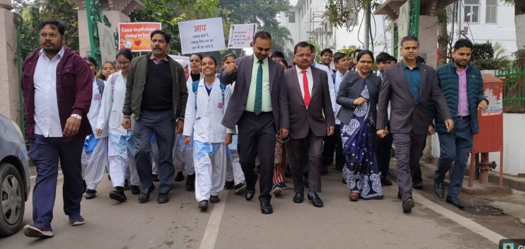 लखनऊ। विश्व कैंसर दिवस–२०२६ के अवसर पर केजीएमयू कुलपति प्रो० सोनिया नित्यानन्द के प्रेरक निर्देशों के अनुपालन में प्रातः ९:०० बजे प्रशासनिक भवन परिसर से कैंसर जैसी घातक बीमारी के प्रति जनसामान्य को जागरूक करने के उद्देश्य से भव्य जनजागरूकता वाकॉथन का आयोजन किया गया।