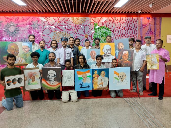 लखनऊ। राष्ट्रपिता महात्मा गांधी और पूर्व प्रधानमंत्री लाल बहादुर शास्त्री की जयंती के अवसर पर लखनऊ मेट्रो के सहयोग से हजरतगंज मेट्रो परिसर में सामूहिक चित्रण कार्यशाला आयोजित हुई। इस मौके पर चित्रकारों ने कला के माध्यम से दोनों महापुरुषों के विचारों को जीवंत किया।चित्रकारों ने गांधी जी को अहिंसा की रोशनी और शास्त्री जी के नारे ‘जय जवान, जय किसान’ को भविष्य की आशा के रूप में कैनवास पर उकेरा। यह आयोजन दर्शकों के लिए केवल चित्रों का प्रदर्शन नहीं, बल्कि विचारों से संवाद का अनुभव बना।