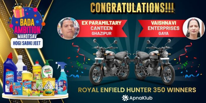 लखनऊ, 28 अगस्त 2025 – अपना क्लब के “बड़ा एंबिशन महोत्सव” ने इस बार रिटेल जगत में खुशियों की नई लहर दौड़ा दी है। गया के वैष्णवी एंटरप्राइजेज और गाजीपुर के एक्स पैरा मिलिट्री कैंटीन इस ग्रैंड सेलिब्रेशन के भाग्यशाली विजेता बने, जिन्होंने शानदार रॉयल एनफील्ड हंटर मोटरसाइकिल जीत हासिल किया।