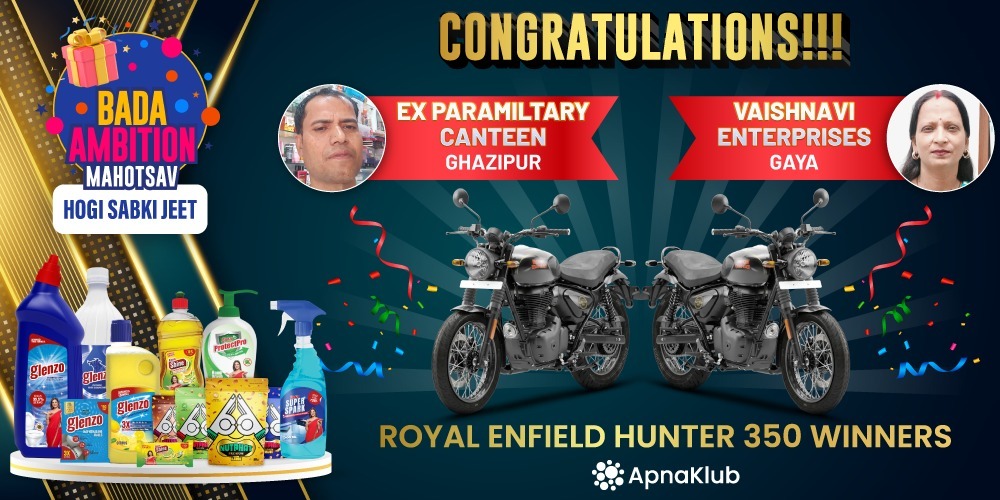 रॉयल एनफील्ड हंटर बाइक जीत कर सुपरस्टार रिटेलर्स बने विजेताओं ने अपनी खुशी जाहिर करते हुए कहा की “ये बाइक सिर्फ एक इनाम नहीं, बल्कि हमारे बिज़नेस ग्रोथ का नया सफर है। अब स्टाइल भी और स्पीड भी – मार्केट दौड़ेगा डबल।”
