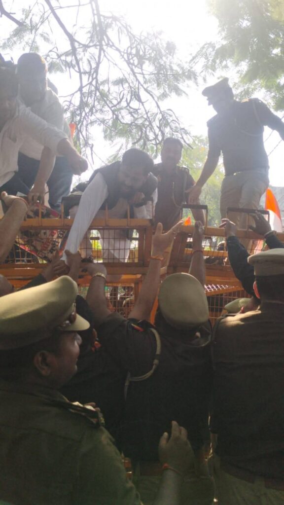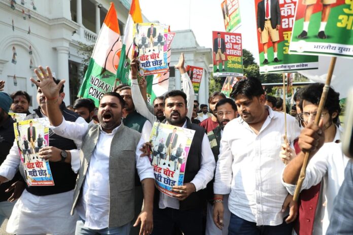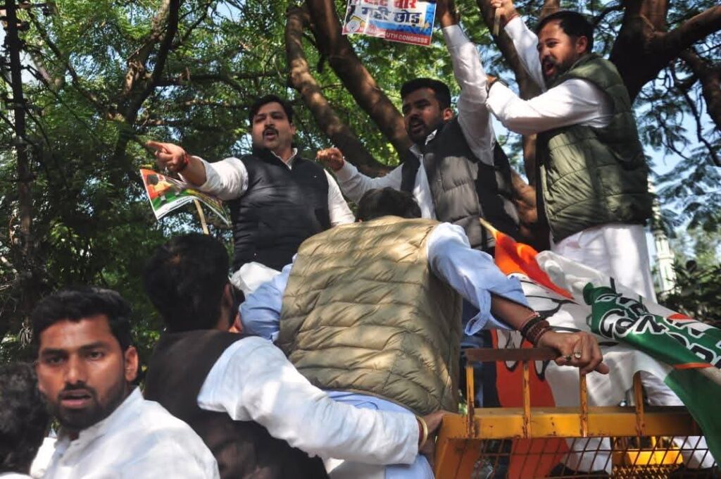 उत्तर प्रदेश युवा कांग्रेस द्वारा एसआईआर के जरिए चुनाव आयोग और भाजपा की मिलीभगत से की जा रही वोट चोरी के विरोध में ‘‘वोट चोर गद्दी छोड़’’ अभियान के तहत युवा कांग्रेसजनों द्वारा लखनऊ प्रदेश कांग्रेस मुख्यालय से निकलकर हजरतगंज स्थित इलेक्शन कमीशन के कार्यालय के घेराव करने के लिए कूच किया। मॉल एवेन्यू चौराहे से आगे बढ़ने पर लाल बहादुर शास्त्री मार्ग के पहले ही युवा कांग्रेस जनों को पुलिस द्वारा बैरीकेडिग एवं भारी पुलिस बल का प्रयोग कर कार्यकर्ताओं को रोका गया और जबरन बसों पर भरकर उन्हें अस्थाई जेल ईको गार्डेन ले जाया गया। इस दौरान युवा कांग्रेसजनों एवं पुलिस के बीच तीखी नोक-झोंक भी हुई।
